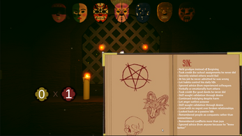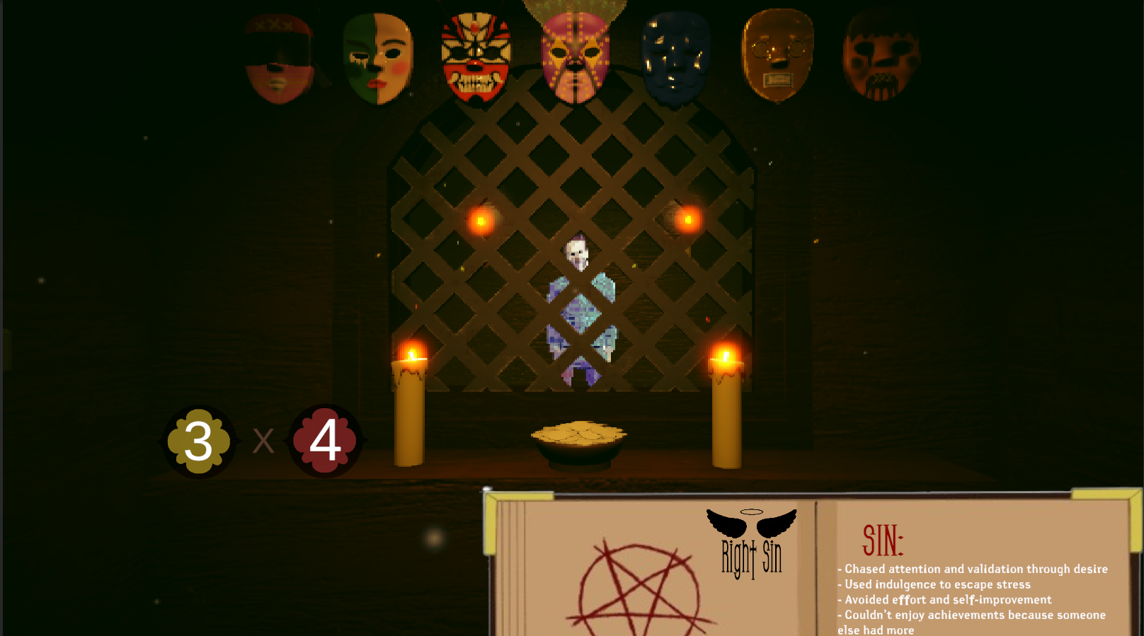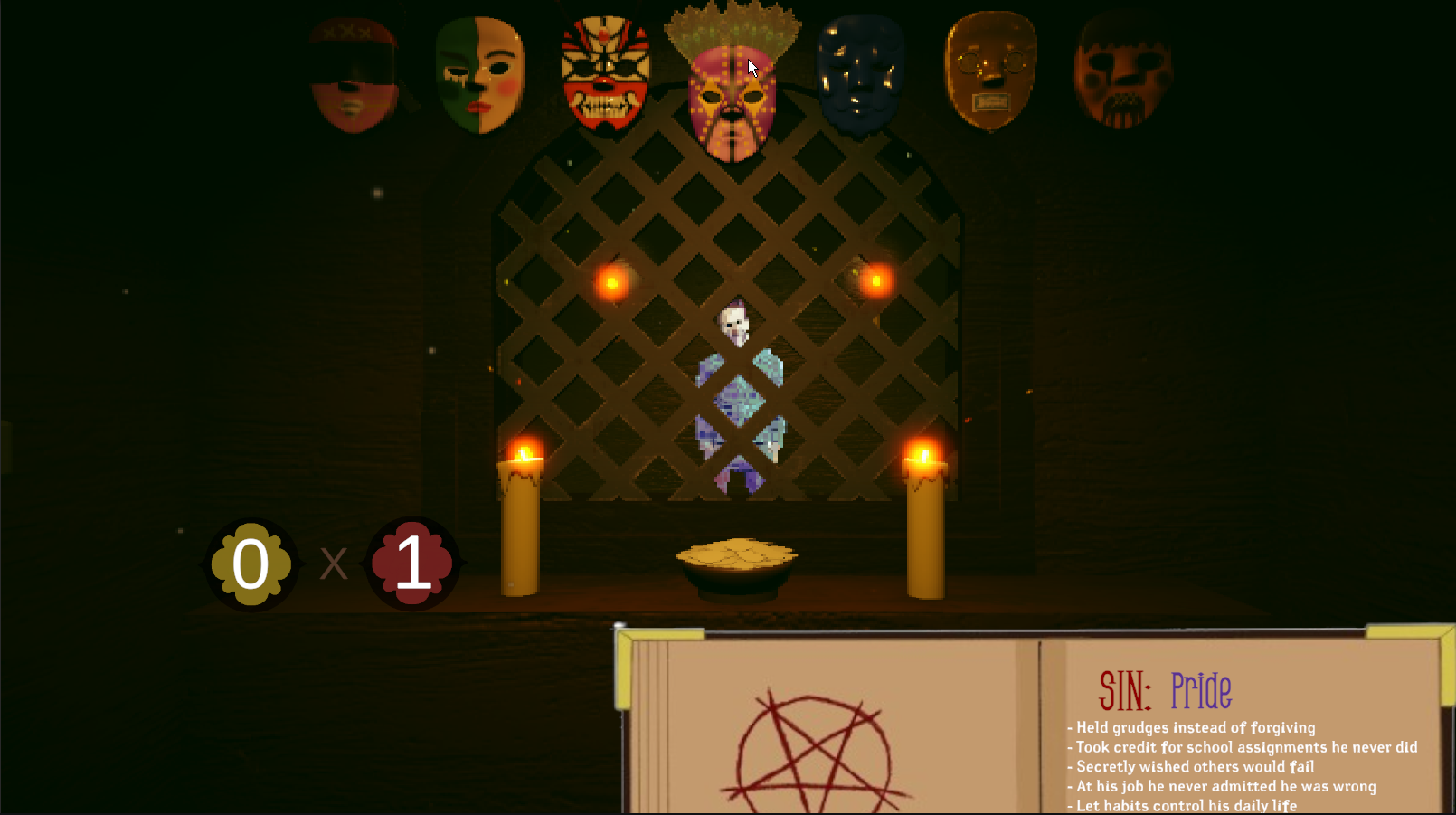 In this game you play as a sort of judge from hell who needs to assign a mask of each seven deadly sins based on their actions through life.