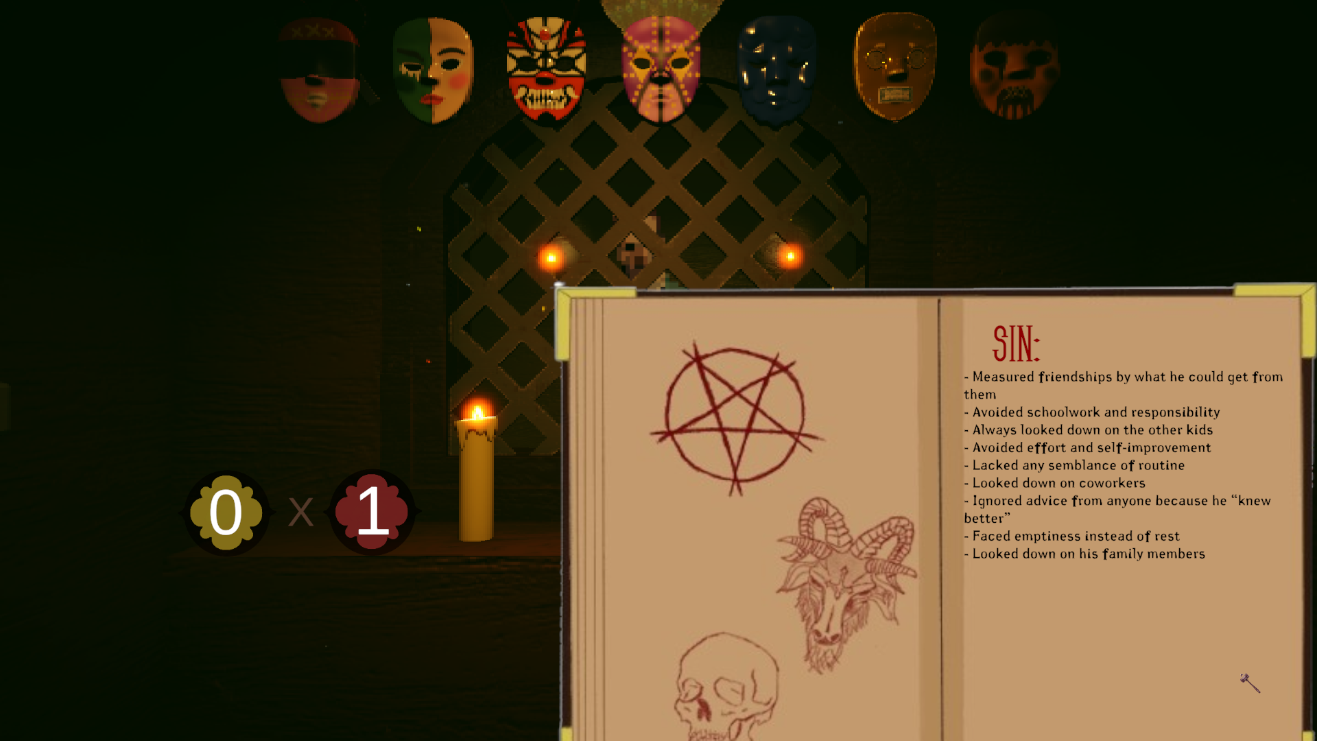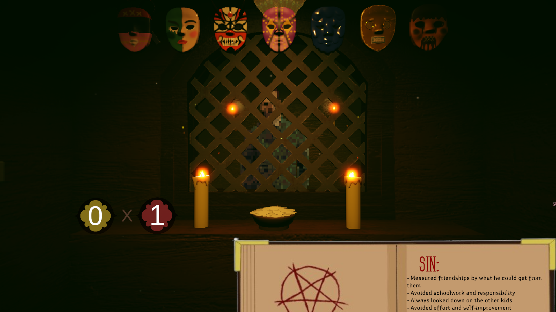 In this game you play as a sort of judge from hell who needs to assign a mask of each seven deadly sins based on their actions through life.